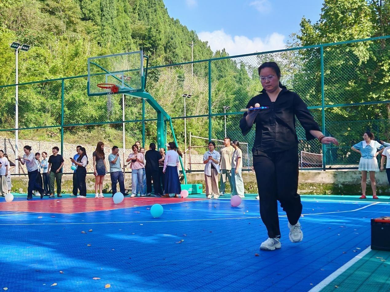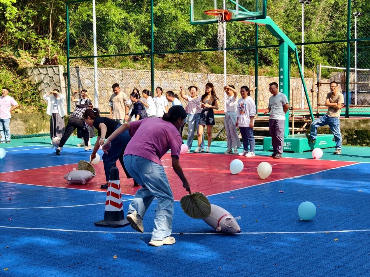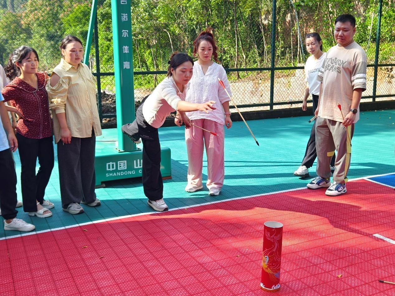 分组竞技环节亮点纷呈。“赶猪”接力考验手眼协调与反应速度,展现教师们的灵动应变;“投壶”竞技融合传统韵味与精准把控,彰显专注品格;“乒乓球接力”聚焦平衡掌控与团队配合,锤炼协作意识;“你划我猜”依托肢体与语言互动比拼默契,现场氛围热烈融洽。老师们积极参与,相互沟通协作,增进了老师们的互动与了解。