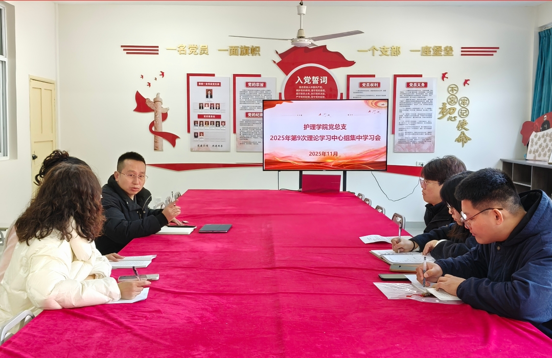 11月27日,护理学院党总支在慧园一舍党员活动室召开2025年理论学习中心组学习(扩大)第9次会议,全体总支委员参加,会议由总支书记彭涛主持。
