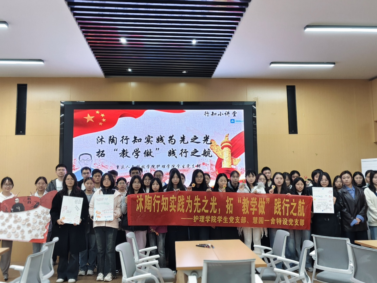 2025年11月,护理学院学生党支部联合慧园一舍特设党支部于慧园一站式服务大厅举办“沐陶行知实践为先之光,拓‘教学做’践行之航”主题小讲堂活动。