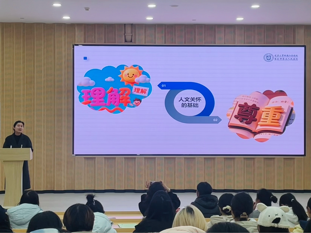 为深化护理专业新生职业认知、破除行业认知壁垒、厚植青年责任担当,12月3日下午,护理学院在卓立楼(第十七教学楼)卓远厅成功举办“锚定未来,守护生命”基层护理职业认知对话会,特邀重庆市第五人民医院护理部主任王英、儿科副护士长曾欣、硕士研究生护士张玄三位行业专家主讲,护理学大一学生代表100余人参会,会议由护理学院教师刘园园主持。